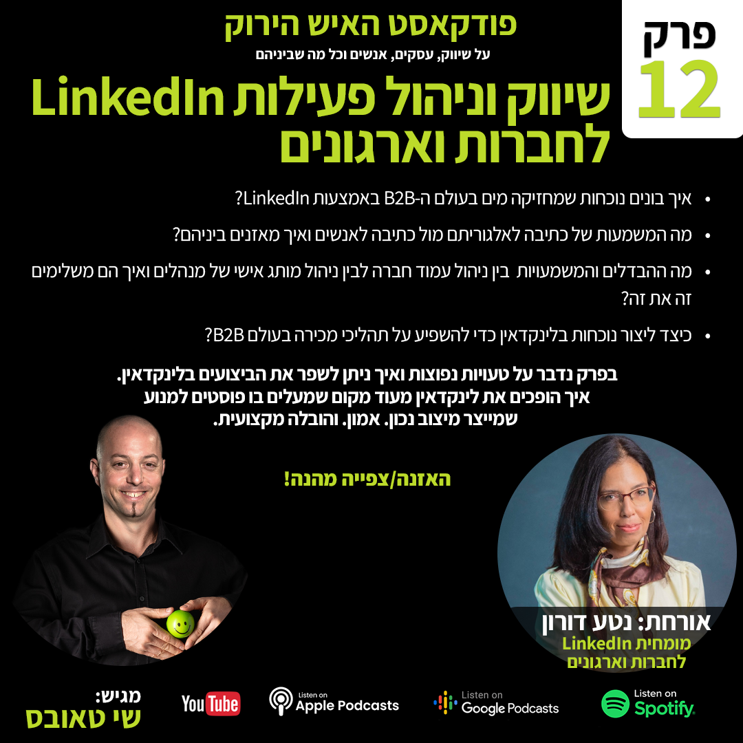 מה בפרק? פודקאסט האיש הירוק עוסק בפרק הזה באחת השאלות שהכי מעסיקות חברות בעולם העסקי איך לבנות נוכחות אמיתית בלינקדאין שניתן לסמוך עליה גם כשמחזורי המכירה ארוכים וגם כשהתחרות על תשומת הלב רק גדלה? במהלך השיחה נטע ואני מפרקים את מה שעובד היום בלינקדאין עבור חברות שפעילות בעולם ה B2B. איך יוצרים מיצוב נכון שמבדל חברה בתוך הענף? איך כותבים בצורה שמדברת לבני אדם אבל עדיין מאפשרת לאלגוריתם להרים את התוכן? ואיך מחברים בין עמוד חברה מסודר לבין נוכחות של מנהלים כדי לייצר מהימנות שמחזיקה לאורך זמן? אנחנו מדברים גם על תהליכי מכירה ארוכים ועל ההשפעה של הופעה עקבית בתודעה של הלקוח למה מנהלים שמציגים נוכחות עוקפת חשדנות מצמצמת חסמים ומקדמת את השיחה העסקית ומה ההבדל בין פעילות שמסתכמת בפרסום פוסטים לבין פעילות שבונה תפיסה מקצועית אמיתית. פרק עם הרבה תובנות פרקטיות. ומה עוד? טעויות נפוצות שגורמות לחברות להישמע כמו כולם דרכים פשוטות לשפר את המסרים ורעיונות שיעזרו לכל חברה להפוך את לינקדאין למנוע שמייצר אמון ותפיסה מקצועית הרבה מעבר לעוד ערוץ שיווקי. הפרק מתאים למנהלים ולחברות שרוצות לעבוד חכם יותר, להופיע בצורה עקבית ולהשפיע על הדרך שבה הלקוחות רואים אותן. האזנה/צפייה מהנה!